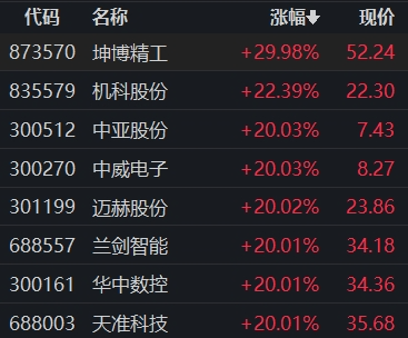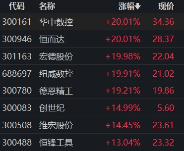 其中,华中数控、恒而达、宏德股份“20CM”涨停,日发精机、华东数控、博杰股份等涨停。