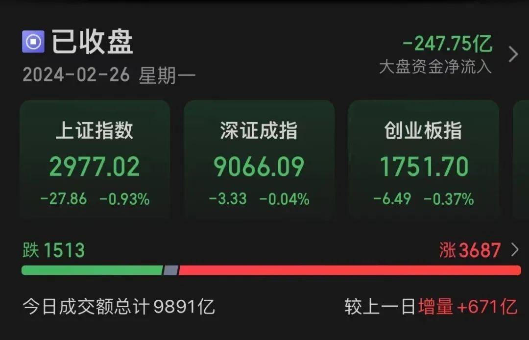 今日(2月26日)A股大盘全天震荡调整,题材小盘股表现活跃。截至收盘,沪指跌0.93%,深成指跌0.04%,创业板指跌0.37%,沪深两市成交额9891亿元。两市超3600只个股上涨。
