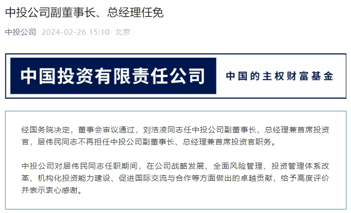 中投公司官方微信公众号2月26日消息,经国务院决定,董事会审议通过,刘浩凌任中投公司副董事长、总经理兼首席投资官,居伟民不再担任中投公司副董事长、总经理兼首席投资官职务。
