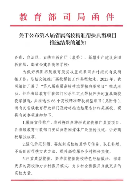 教育部在此次推选结果中,对各相关单位提出三项要求:一是做好宣传推广,以多种形式宣传典型项目,讲好高校帮扶故事;二是强化示范引领,组织高校相互学习借鉴,创新帮扶方式方法,提升服务乡村振兴实效;三是注重典型挖掘,持续探索高校助力乡村振兴的新模式,为乡村全面振兴汇聚更多高校力量。