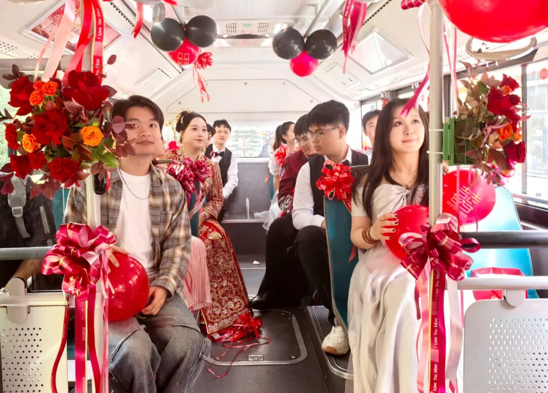 图为湄潭县一对新人搭公交婚车,流动车厢演绎别样浪漫