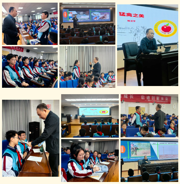 杨老师不仅科普了猛禽的生态知识,更引导同学们关注生物多样性、保护自然环境。他讲述了猛禽在生态系统中的重要作用,以及人类保护猛禽的意义,让同学们在感受 “猛禽之美” 的同时,树立尊重自然、守护生态的意识。同学们听得津津有味,不少同学还认真记录,对自然科学产生了浓厚兴趣。