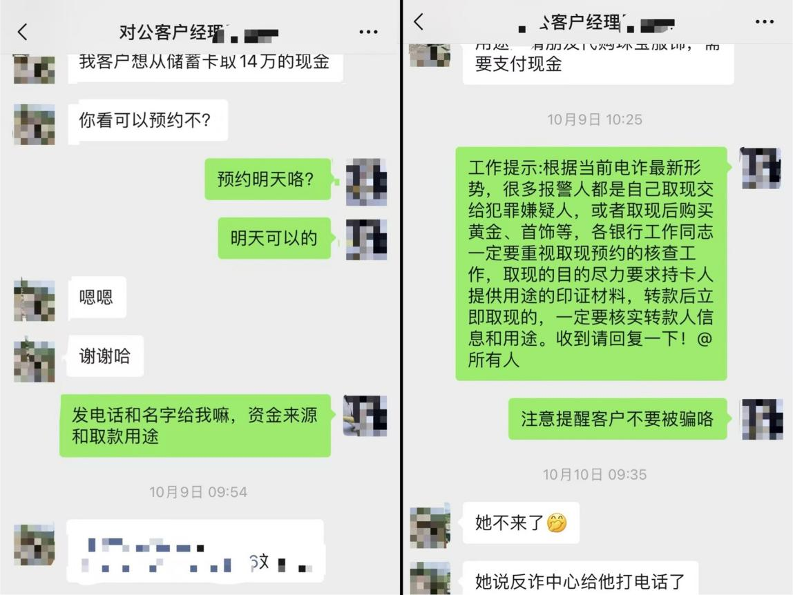 据了解,10月9日,一名客户向平安银行贵阳花果园支行预约了次日取现14万元,声称用于请朋友代购珠宝服饰。然而,这一交易引起了支行内控主任的高度关注。凭借专业的经验和敏锐的直觉,内控主任意识到这一情形与近期电信诈骗的新趋势高度相似。