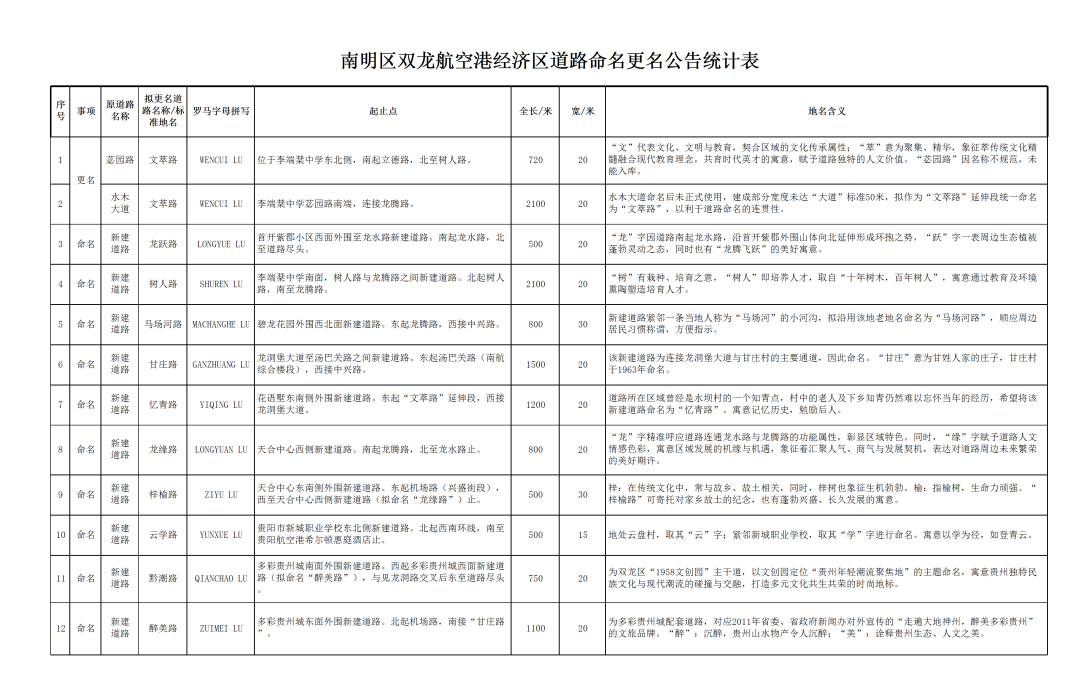 贵阳这11条道路有了名字 贵阳市民政局 | 2025-10-13 11:06 根据国务院《地名管理条例》第十三条、第十四条地名备案和公告的有关规定,贵阳市南明区双龙航空港经济区龙跃路、树人路、马场河路、甘庄路、忆青路、龙缘路、梓榆路、云学路、黔潮路、醉美路、文萃路(由苾园路、水木大道建成部分合并更名)共11条道路的命名更名已经由贵阳市人民政府批准,现予以公告。符合国务院《地名管理条例》第十八条规定的任何机关团体和企事业单位,都必须使用公告中的标准地名。贵阳市民政局2025年10月11日 编辑: 范洋 责编: 李佳 编审: 彭奇伟