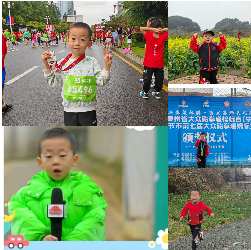 因为爸爸是铁人三项世界冠军、亚洲冠军周廷学,他的故事还被拍成了电视节目。他不仅是我的偶像,更是我心中的英雄!作为冠军的儿子,我在幼儿园也努力表现自己,获得过“小学霸”“故事大王”“跑步冠军”等称号。2025年,我还完成了人生第一次马拉松——贵马5公里跑。