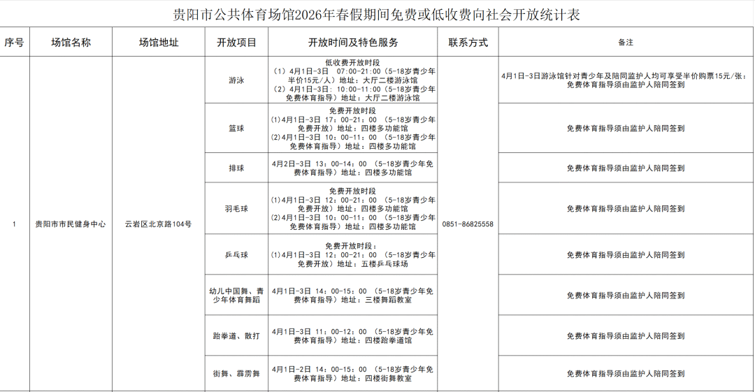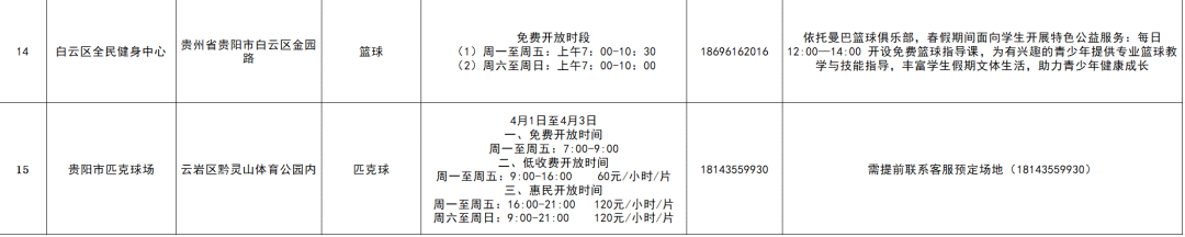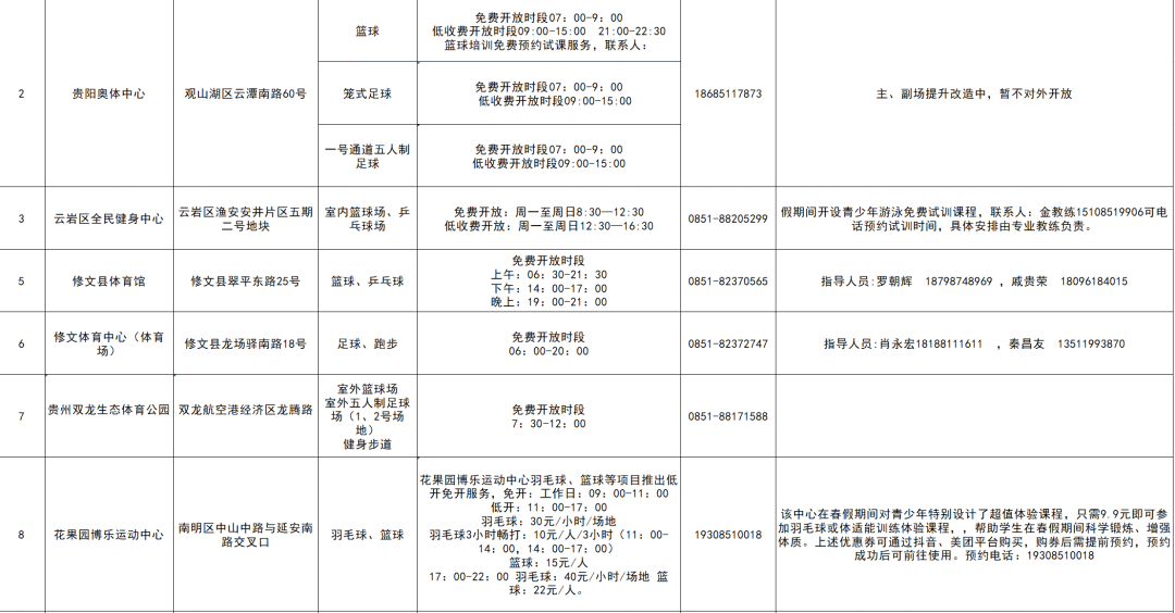 据悉,除此之外,贵阳奥体中心、贵州双龙生态体育公园、花果园博乐运动中心、贵阳市匹克球场;云岩区、修文县、开阳县、清镇市等地的公共体育场所在春假期间都设置了免费、低收费时段,满足了市民多样化运动需求,保障了学生充足的运动空间。
