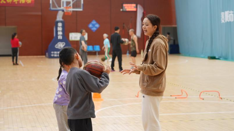 走进贵阳市市民健身中心篮球馆,记者看见篮球训练场一分为二,既有免费时间段打篮球的市民,也有报名参与篮球指导课程的孩子们,篮球班的教练耐心细致教导基础动作,学员们学得很认真。