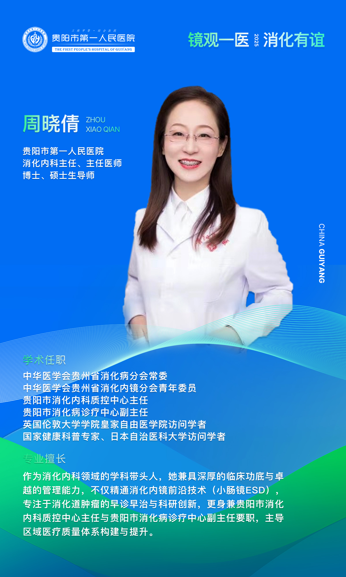 在消化内镜的方寸之间,有一束光,为我们照亮生命的细微之处;在守护健康的漫漫长路,有一群人,为我们披荆斩棘。他们,是医生,是护士,是并肩作战的“消化人”。“镜”观一医,消化有“谊” ,本期,让我们一同认识贵阳市第一人民医院消化内科主任——周晓倩。
