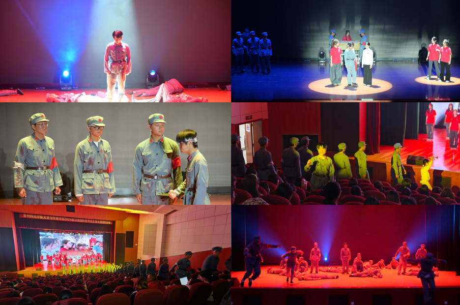 本次主题团日活动采用沉浸式舞台剧《困牛山下的课堂》贯穿全场,该剧目为文传学院原创剧目,起源于贵州师范学院文学与传媒学院和苏州大学文学院两校携手在困牛山红军学校开展暑期“三下乡”社会实践活动。剧中,两校学生代表互动交流,穿插展示了缠花技艺、书法创作、剪纸艺术等,生动展现了中华优秀传统文化的独特魅力,文传学子传承文化、沟通中外的使命担当,体现了两校跨越千里携手传承红色基因、推普助力乡村振兴的友谊。