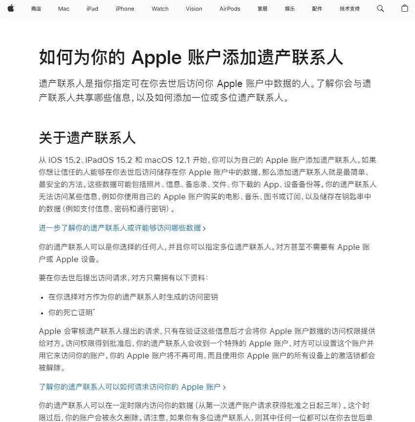 苹果官方网站显示,“遗产联系人”是指用户指定的可在该用户去世后访问其Apple账户中数据的人。据介绍,若用户希望信任的人在其去世后能访问自身Apple账户中的数据,可指定一人或多人作为遗产联系人。此外,遗产联系人需持有用户指定其为联系人时生成的访问密钥,以及用户的死亡证明,便可以申请在一定时限内访问用户的数据。
