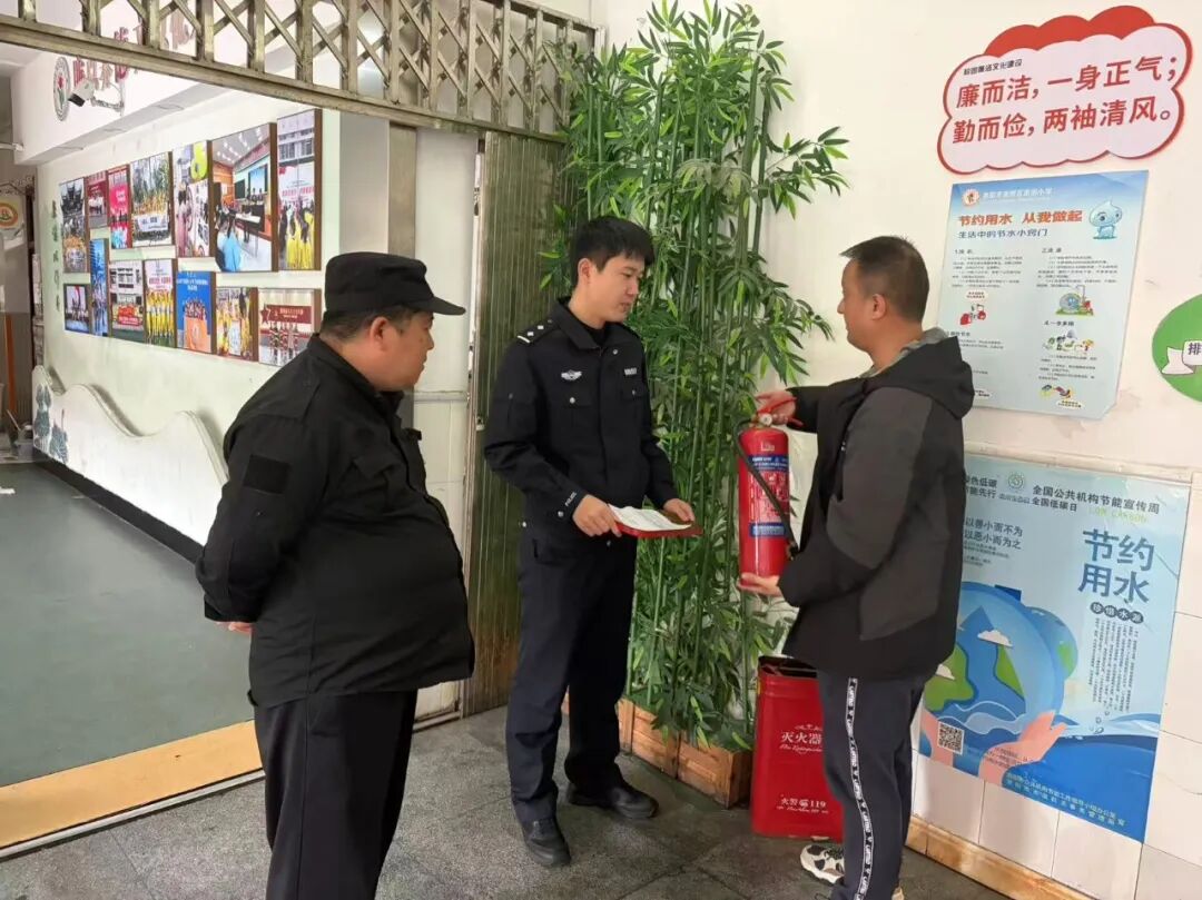 图丨西湖路派出所民警张明豪在南明小学检查消防安全设施
