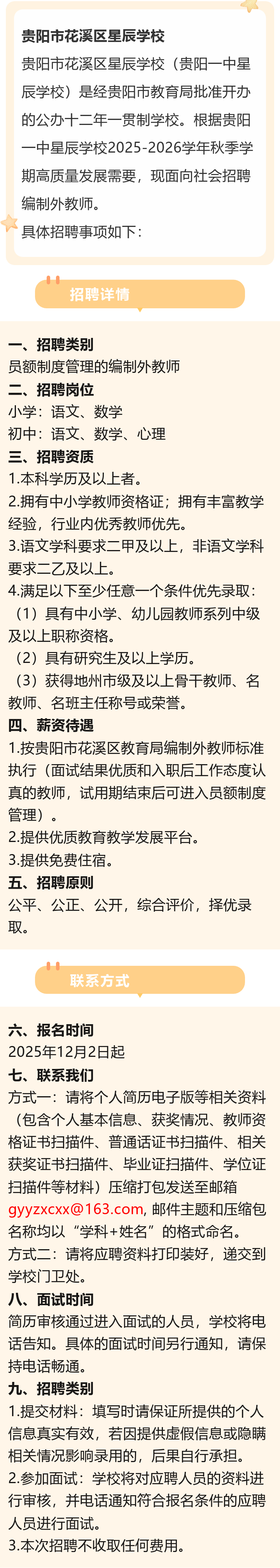 【事业单位】贵阳市花溪区星辰学校(贵阳一中星辰学校)招聘!提供免费住宿!