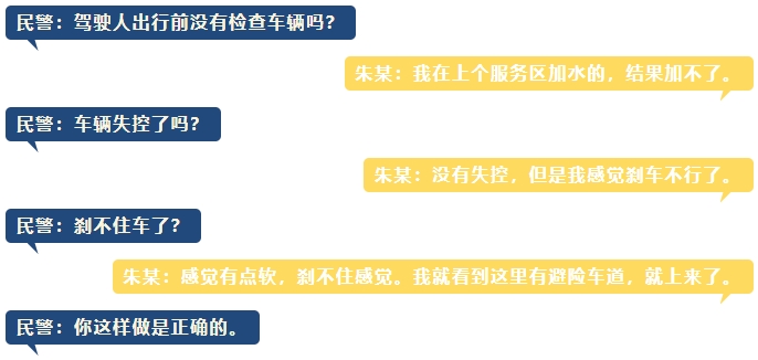 经询问得知,朱某当天驾驶货车载化肥由泸州到夜郎,行驶至此路段时,发现刹车水没有了,刹车失效,看见前方有避险车道,便径直冲上避险车道。