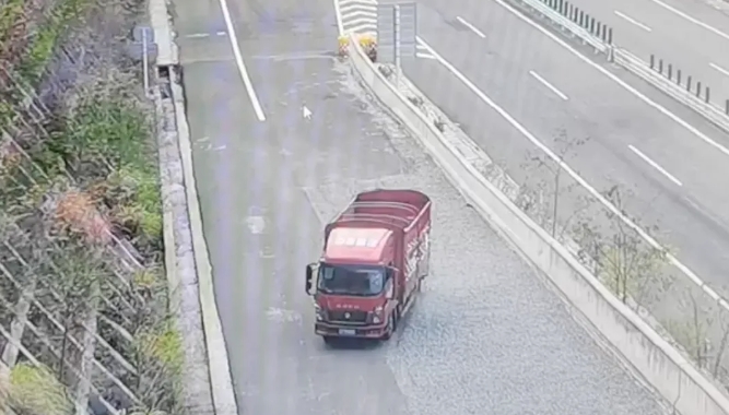 高速五大队民警抵达现场后看见,一辆车牌号为云FP**80的轻型仓栅式红色货车冲入避险车道100余米远,车辆轮胎被铺满的松软砾石裹住,不能动弹,车辆前方保险杠受损。