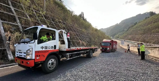 随后,救援人员驾驶拖车前来,把货车从避险车道中拖出,并将车辆驾乘人员安全带离高速公路。