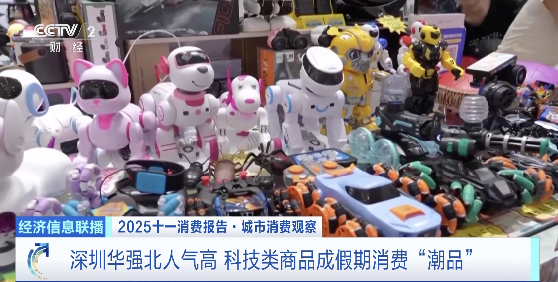 除了客流活跃,这个假期的深圳消费市场也展现出“新、智、潮”的鲜明特色。在华强北,来自全国的游客开启“进货式旅游”,智能穿戴、AI玩具等电子产品成为热门选择。假期前7天,华强北步行街吸引客流250万人次,同比增长12%,拉动消费9700万元,同比增长约7%,人气可见一斑。