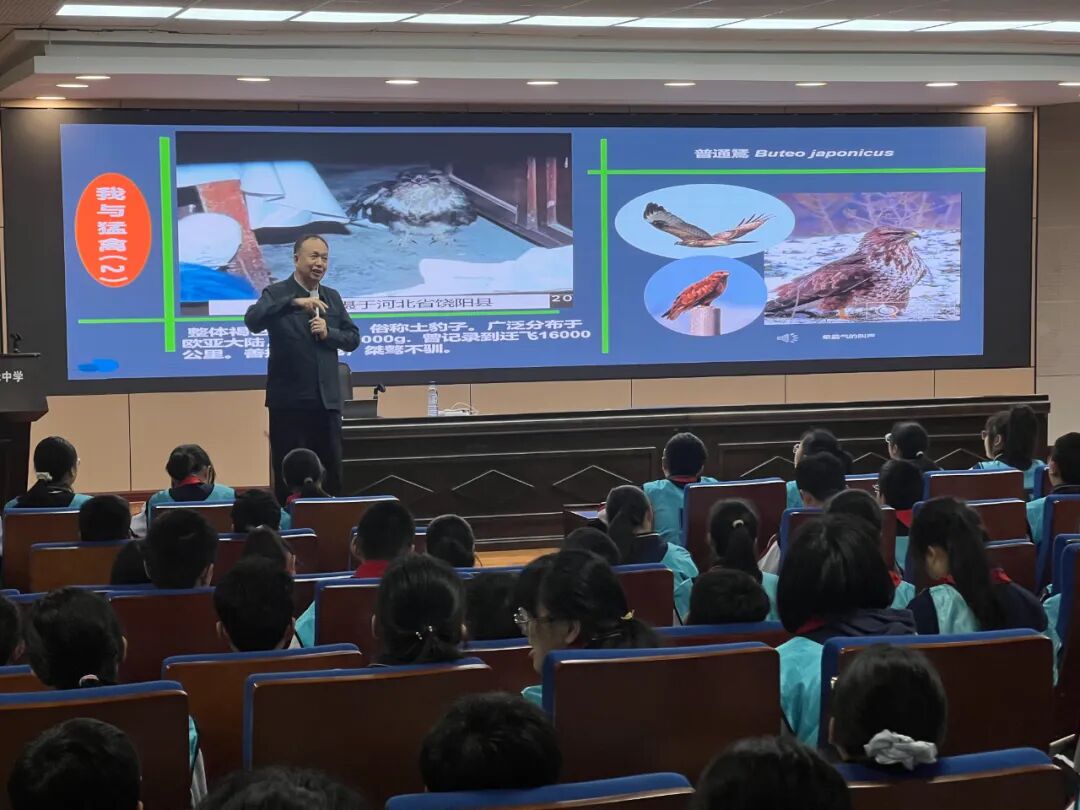 杨老师不仅科普了猛禽的生态知识,更引导同学们关注生物多样性、保护自然环境。他讲述了猛禽在生态系统中的重要作用,以及人类保护猛禽的意义,让同学们在感受 “猛禽之美” 的同时,树立尊重自然、守护生态的意识。同学们听得津津有味,不少同学还认真记录,对自然科学产生了浓厚兴趣。