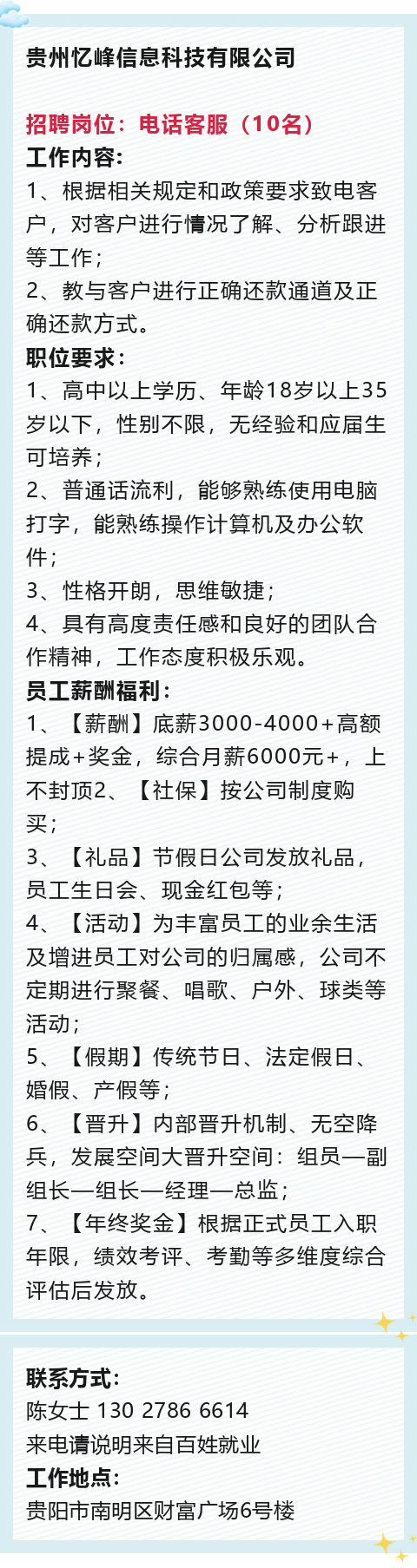 【贵阳市南明区】贵州忆峰信息科技有限公司招聘!综合月薪6000元!