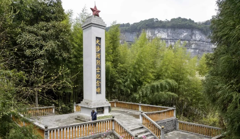 大沙河烈士纪念碑修建于1989年10月,位于阳溪镇四坪村大沙河组。此地危崖耸立,下临深谷,山路陡曲逼仄,是道真北境通向武隆赵家坝的一条独径小道,原名叫箐碥,俗称白炭窑子。