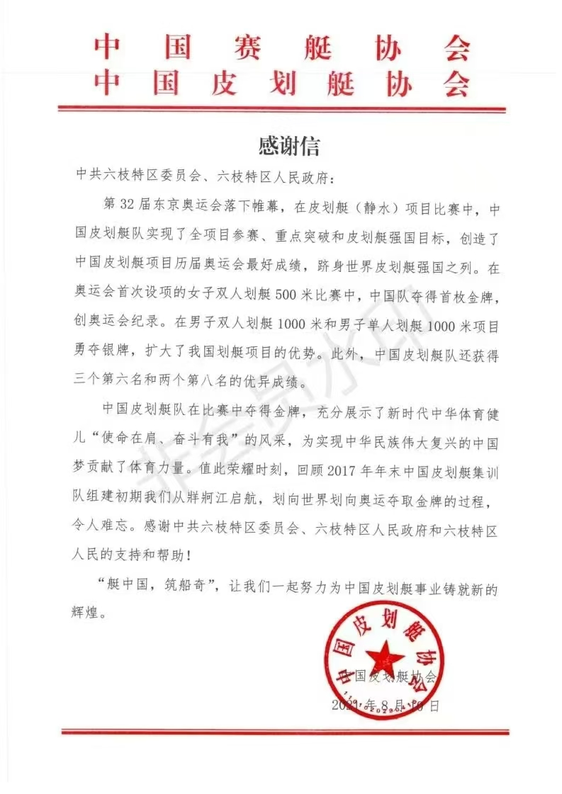2021年8月,六枝特区收到了来自中国皮划艇协会的一封感谢信。信中这样写道:“值此荣耀时刻,回顾2017年年末,中国皮划艇集训队组建初期,我们从牂牁江启航,划向世界、划向奥运夺取金牌的过程,令人难忘。感谢六枝特区党委、政府和六枝人民的支持与帮助。”