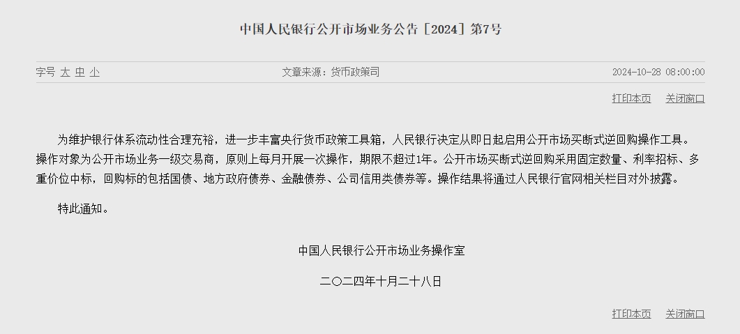 中国人民银行决定从即日起启用公开市场买断式逆回购操作工具