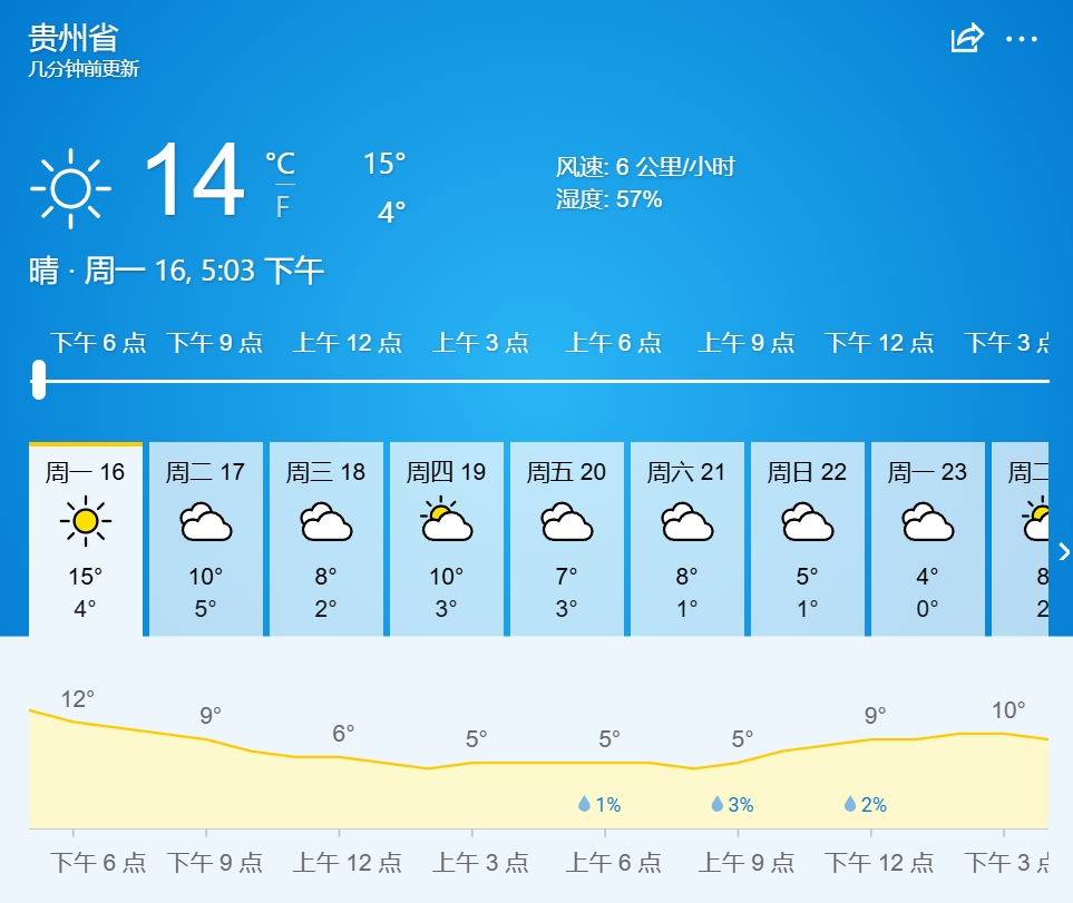 下图是未来一周贵州的天气,记者从贵阳市气象台获悉,昨天午后,贵阳贵安各地气温明显回升,最高气温为18.9℃。贵阳市气象台预计,白天以多云为主的天气可能持续到本周四(12月19日),大家记得根据天气变化,及时增减衣物哟~
