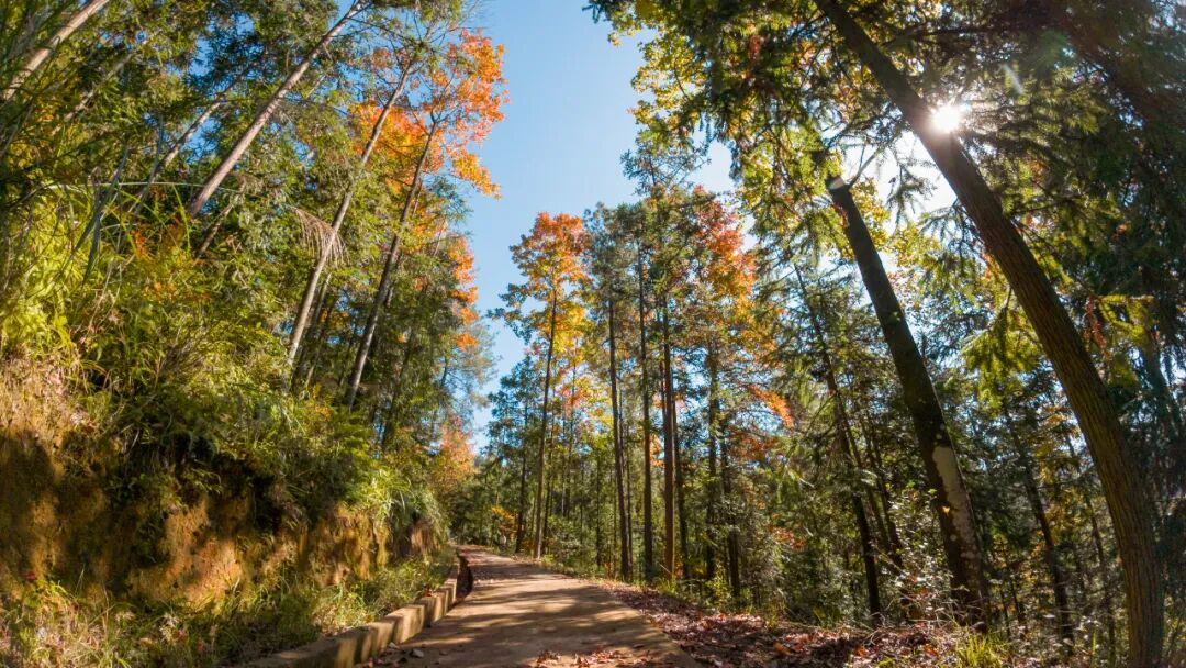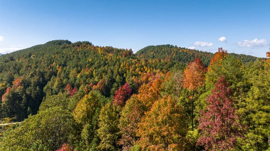 在龙塘镇双窝坑的山间田野,成片的枫叶与银杏交相辉映,阳光透过枝叶筛下斑驳光影,洒在蜿蜒的林间小道上,构成一幅绝美的自然画卷。