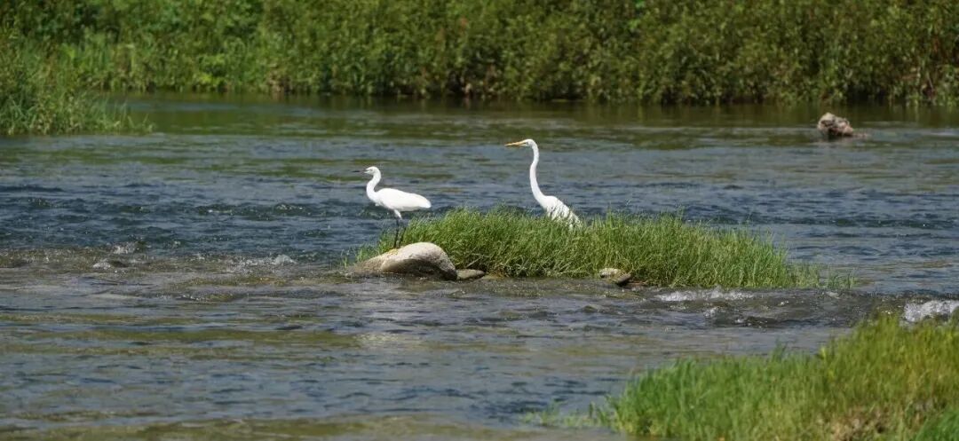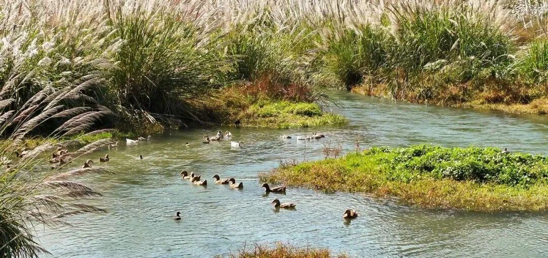 在龙川河畔,白鹭舒翼掠水、鸭群逐波嬉戏,成片的银白芦苇沐风轻摇,暖阳斜洒而下,仿佛为其披上一层清辉银霜。