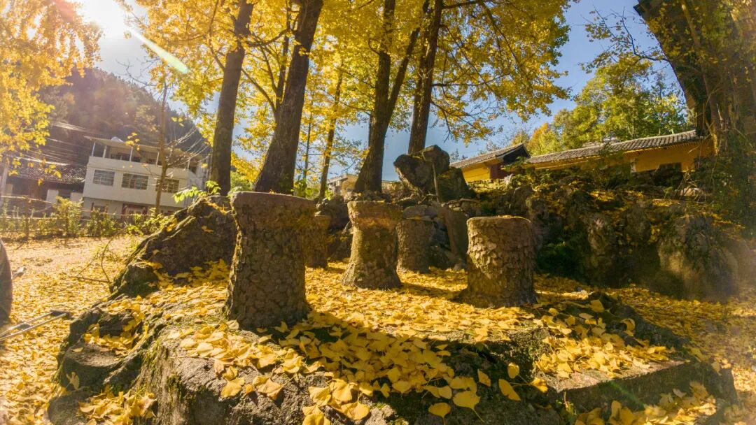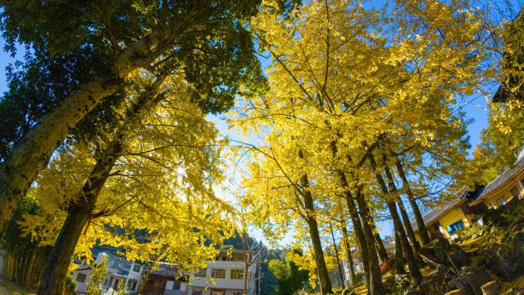 在龙井乡天堂寨,两棵三百余年的古银杏树高大挺拔,枝繁叶茂,金黄的扇形叶片在微风中轻轻摇曳,宛如无数金色的蝴蝶翩翩起舞。