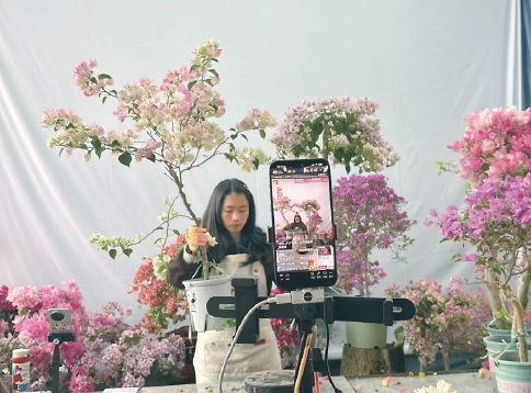 近年来,福建省漳州市漳浦县官浔镇溪坂村为破解传统花木产业市场饱和、销量下降等难题,凭借全省最大的花卉生产出口基地及集散中心地位和花卉苗木资源优势,探索发展“庭院景观+电商”的新模式,着力打造花卉电商产业新业态,推动产业提质增效。图为溪坂村村民正在种植基地直播售卖三角梅。农民日报全媒体记者 郭诗瑀 摄