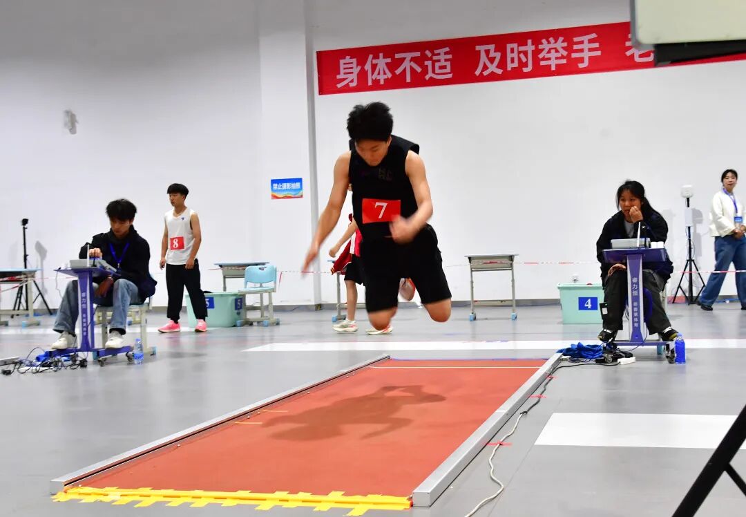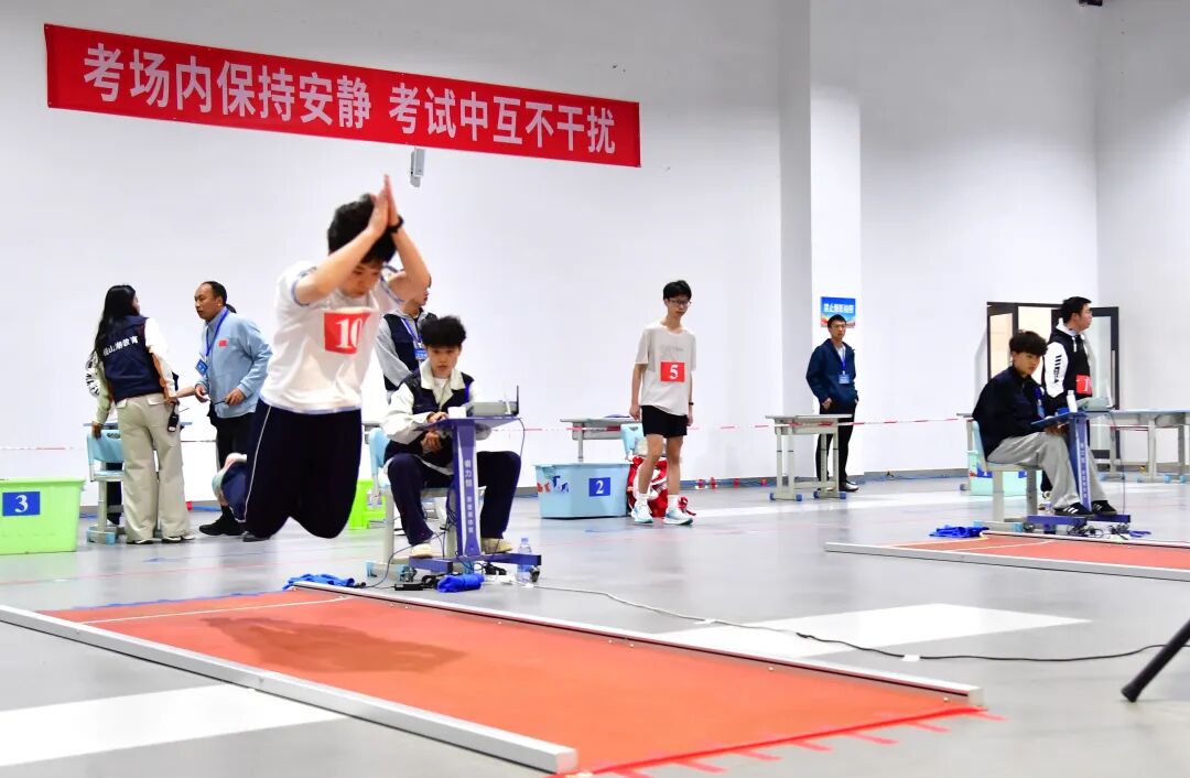 考试现场秩序井然、活力满满。在立定跳远测试区域,考生跟随工作人员的指引有序进场考试,每一次起跳、落地都凝聚着平日的练习与努力。考试现场的考官也耐心向考生交代注意事项,确保考试的高效、公正。