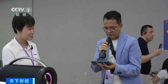 在一家音箱展台前,托马斯,一位来自柬埔寨的采购商,正在检验音箱的效果,现场他唱了一首柬埔寨的传统歌曲。