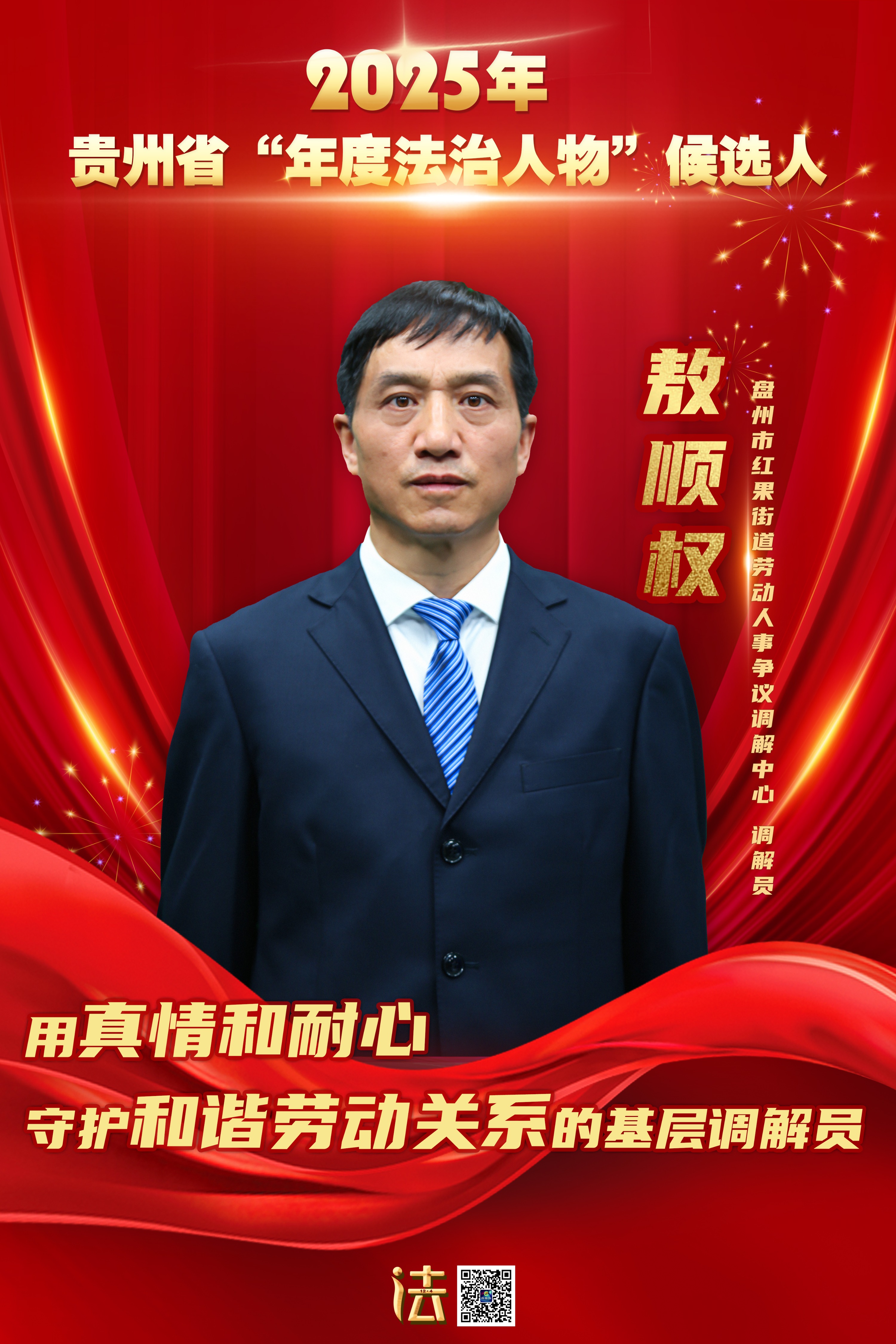 敖顺权,现任盘州市红果街道劳动人事争议调解中心调解员。扎根基层20余年,他始终坚持以“调解千家事,温暖万人心”为信念,凭借深厚的为民情怀和过硬的专业能力,筑牢基层和谐“第一道防线”。近年来,他成功帮助1920余名劳动者调解劳动争议纠纷1300余件,涉及金额2.12亿元。红果街道调解中心多次获评省、市级示范单位,2022年获人社部等四部门通报表扬。