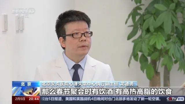 北京安贞医院心律失常中心执行副主任 龙德勇:春节的话,如果有的人回乡过年旅途劳顿,那么春节聚会时有饮酒,有高热高脂的饮食,还有这种生活的不规律,还有久坐不动,这都是可以诱发房颤或者是对已有房颤的人房颤发生率增加这些因素。所以说我们说假日心脏综合征其实都是跟这种生活方式改变所引起所导致的。