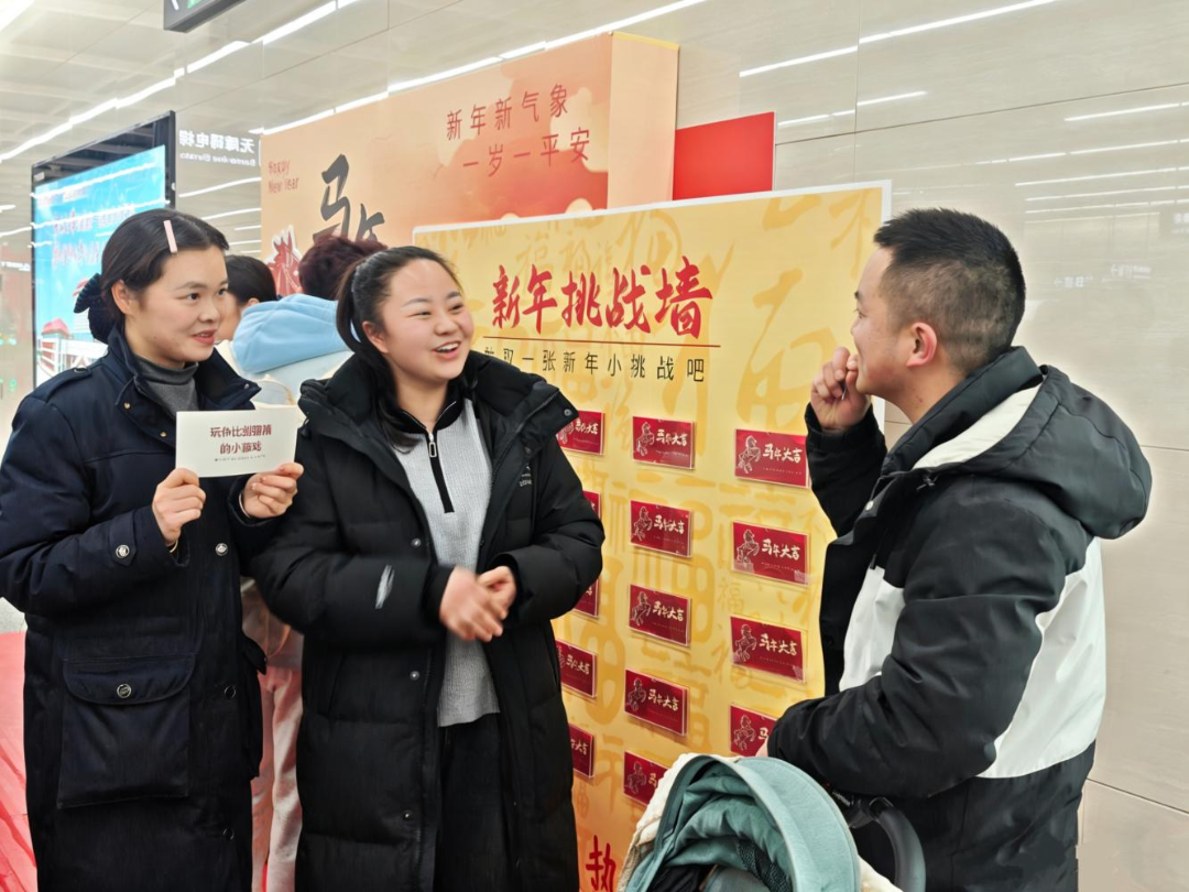 在人流往来的贵阳北站,“新年大挑战”活动人气爆棚。乘客们纷纷驻足,抽取挑战墙上的趣味任务卡,完成暖心挑战。有人拨通父母电话,诉说归乡的牵挂;有人组队互动,趣味竞猜地铁设备;还有人拥抱同行伙伴,传递冬日温暖。一个个简单又走心的小任务,为奔波的旅途增添了欢乐与温情。现场年味十足、暖意融融,成为春运途中一道温馨动人的风景线。
