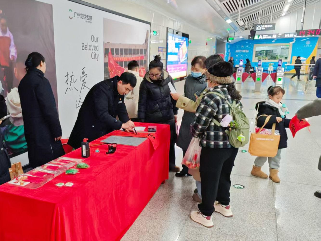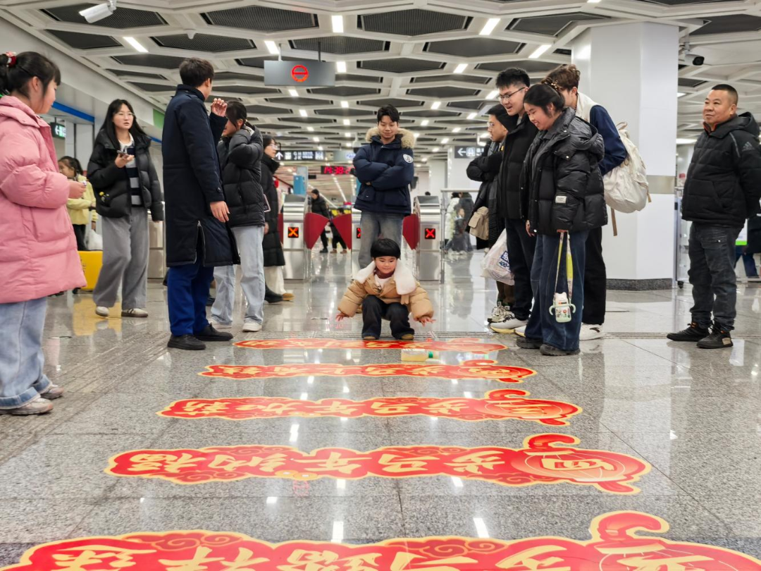 在省人民医院站,车站以写春联、送祝福的形式,传递浓浓年味。工作人员铺纸研墨、挥毫落笔,一副副寓意吉祥的春联跃然纸上,“骏马迎春添吉庆,福星入户纳安康”“马跃前程开胜景,春临大地纳祥瑞”……乘客们排起长队,有的挑选心仪的联句等候书写,有的围在桌旁驻足观赏,领到春联的乘客脸上满是喜悦,小心翼翼地捧着墨迹未干的春联,将新春福气带回家。