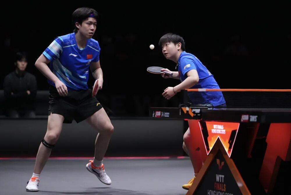 2025年12月13日,王楚钦/孙颖莎(右)在2025年世界乒乓球职业大联盟(WTT)总决赛混双决赛中。新华社发(吕小炜摄)