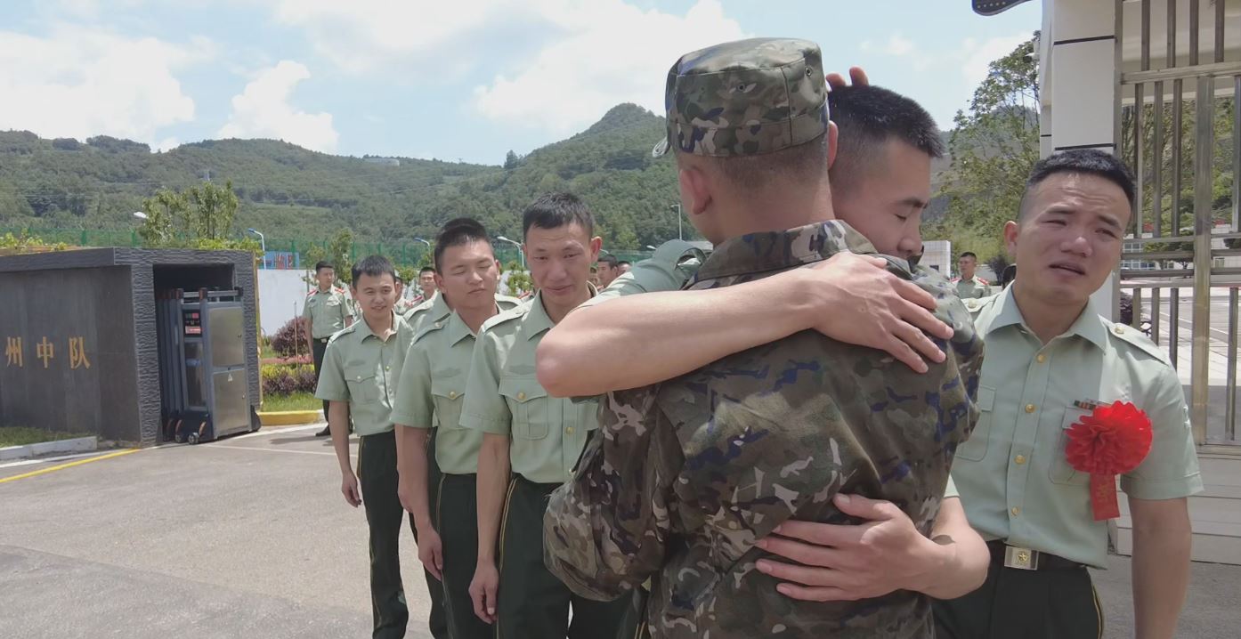 在与留队的战友拥抱分别之际,退役士兵难掩不舍的情绪,泪洒军营。