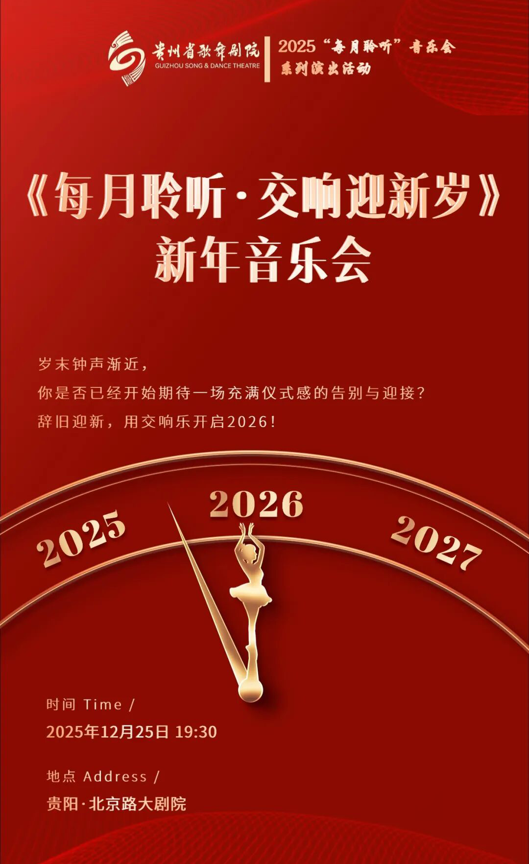2025年12月25日19:30,贵州省歌舞剧院“每月聆听·交响迎新岁”新年交响音乐会将在北京路大剧院华彩上演。一场汇聚磅礴气势与优雅格调的音乐盛宴,即将用交响乐章为您奏响辞旧迎新的序曲。