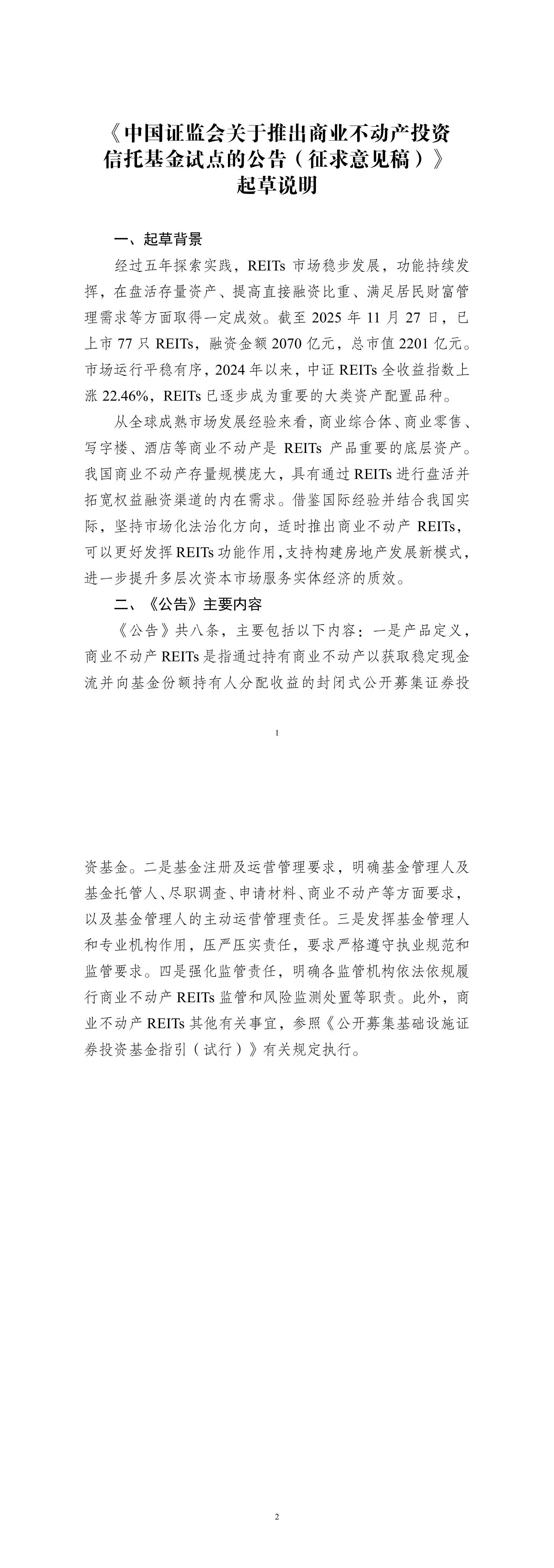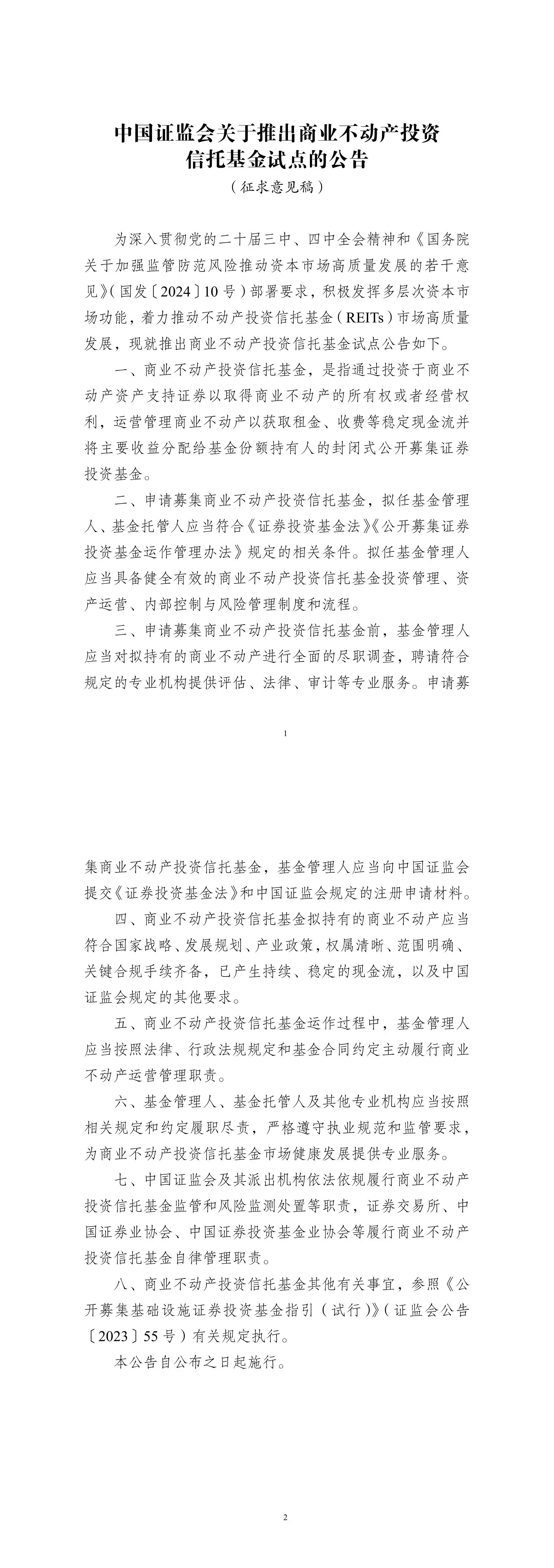 证监会发布《中国证监会关于推出商业不动产投资信托基金试点的公告(征求意见稿)》,全文如下: