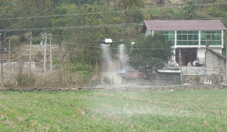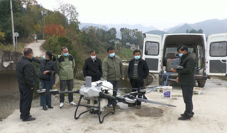在本庄镇乐桥村,一场油菜菜青虫飞防工作正在开展,工作人员严格按照虫害防治要求,将多种农药按比例混合,利用植保无人机对坝区进行集中防治,确保油菜长势。