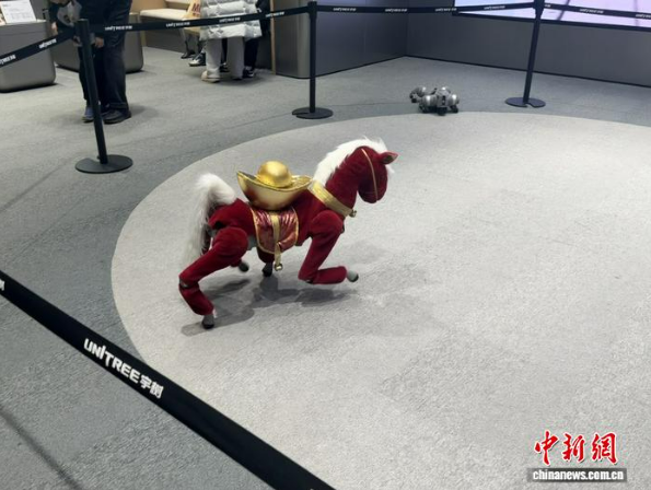 在北京朝阳区的一家商场,一只银白色四足机器狗正稳稳踱步于商场中庭,它身披红色马年新衣,身背金色元宝装饰,在场中踏步转圈、点头致意,引得围观市民连连惊叹。