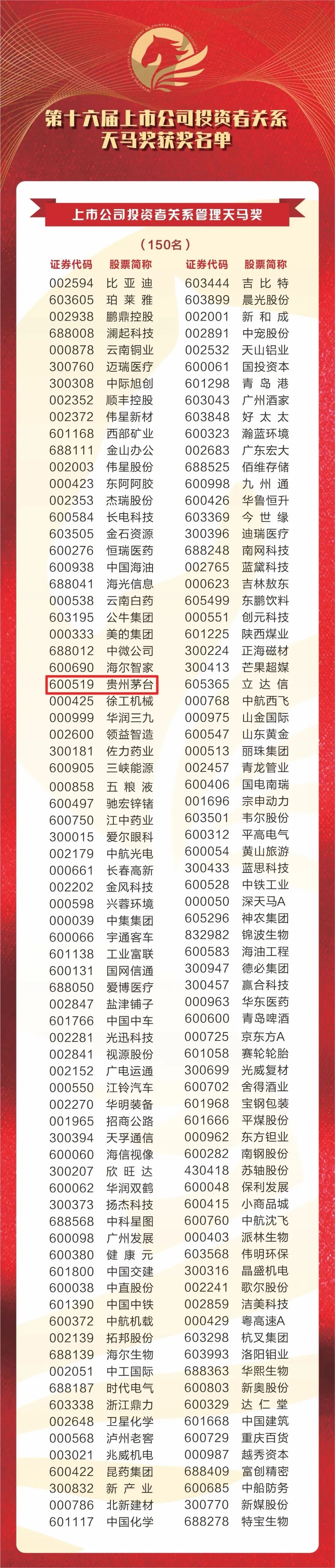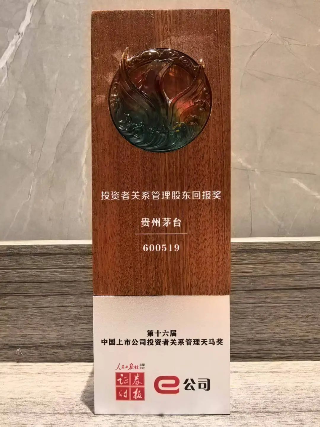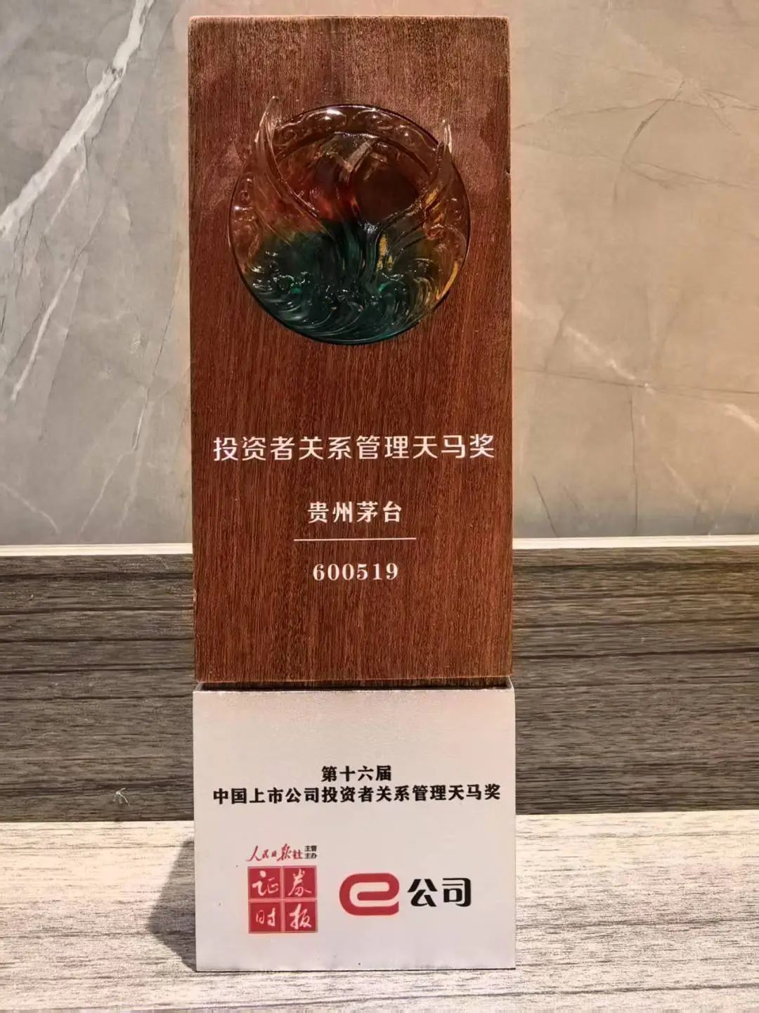 6月13日,由证券时报社主办的第十六届上市公司投资者关系管理天马奖获奖名单正式公布,贵州茅台凭借卓越的投资者关系管理实践与显著的股东回报成效,荣获“上市公司投资者关系管理天马奖”和“上市公司投资者关系管理股东回报奖”。