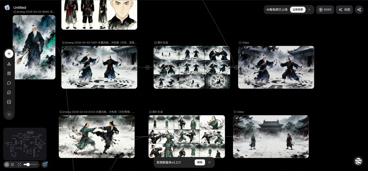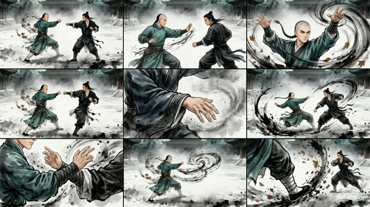 团队以AI技术重构创作流程,将制作周期压缩至三天,基于史料与文献,在AI先导片中以十组动态水墨武侠风场景,再现曹维城山林习武、校场比武的情形,让历史人物在数字世界中重现光芒。