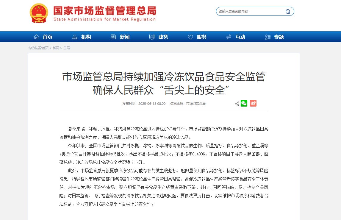 市场监管总局:3605批次冷冻饮品抽检合格率超99.5%