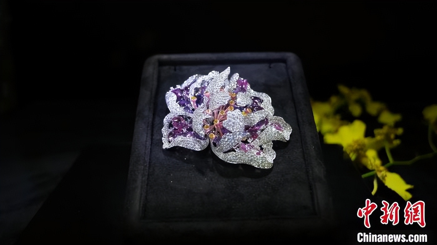 4月13日,第五届中国国际消费品博览会在海南海口举行,图为会上首发首秀的LARWINER艺术珠宝2025年度作品“盛世开泰彩色蓝宝石钻石牡丹胸针”。陈英清 摄