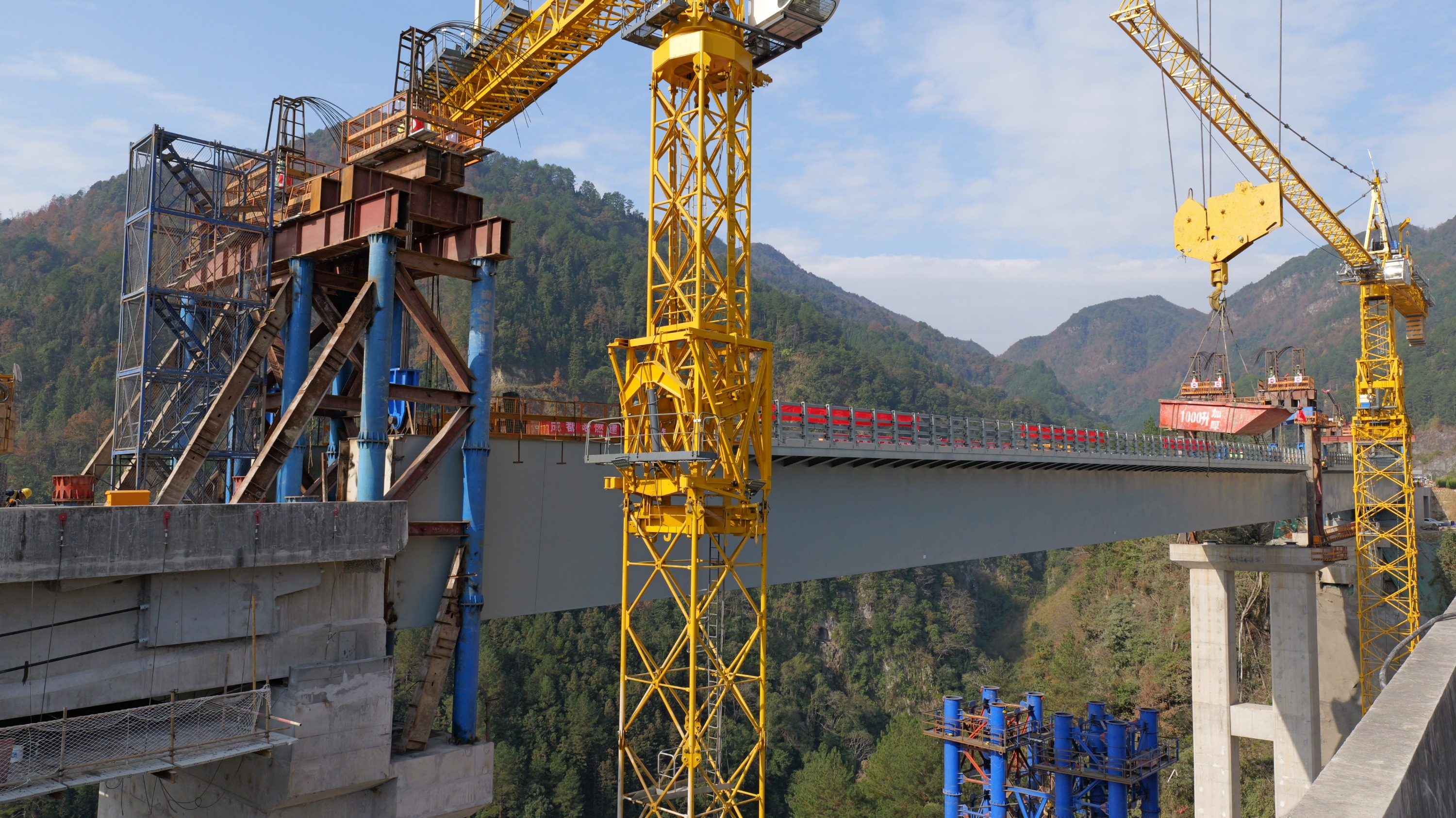 猴子河特大桥位于贵州省黔南州三都县都江镇,恢复后的大桥全长912.4米,最大墩高135米,主桥采用三向预应力混凝土连续刚构。猴子河特大桥都匀岸部分引桥由原来的简支T梁结构改造为钢箱梁结构,单幅重量超过1900吨,左幅长178米,右幅长153米,更好地适应复杂山区地形,显著提升了桥梁的整体稳定性与行车安全。