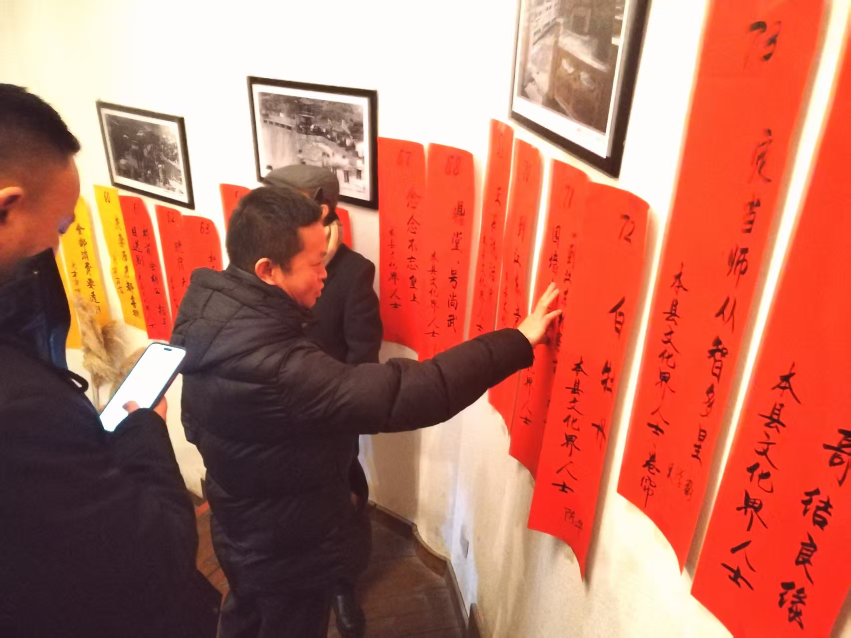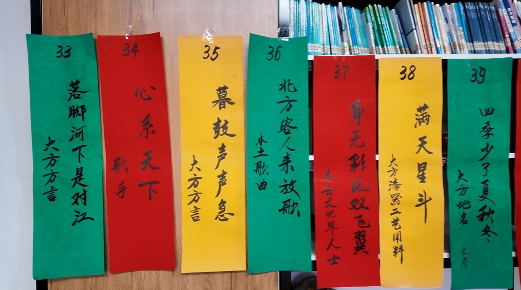 本次展猜活动谜作以大方乡土文化、民族文化为主、为拉近身居异乡本县籍文化界人士与家乡距离,一些旅居县外文化界人士的芳名也被蒙成一条条典雅的灯谜作品投入展猜活动中,这些五颜六色的谜条密布九驿书院,给书院披上喜庆色彩的盛装,一条条颇具地方特色的灯谜作品,从门厅前到室内,沿书院楼梯循环渐上至二楼活动室演艺大厅,使整条楼道洋溢出浓浓的文化氛围。