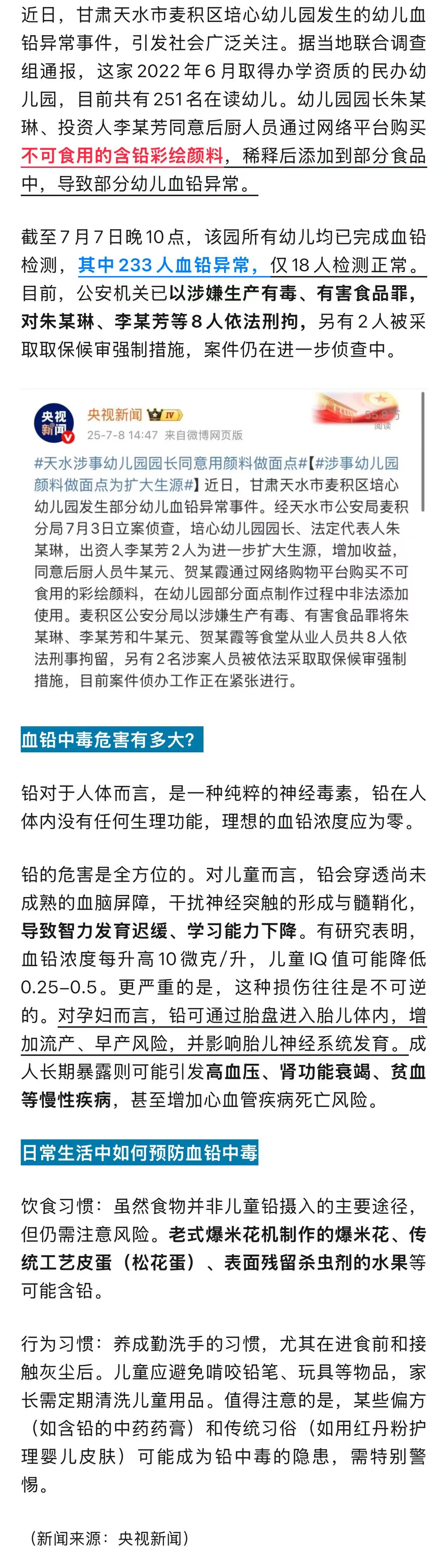 在食品中违规添加含铅彩绘颜料致幼儿铅中毒!天水一幼儿园8人被刑拘