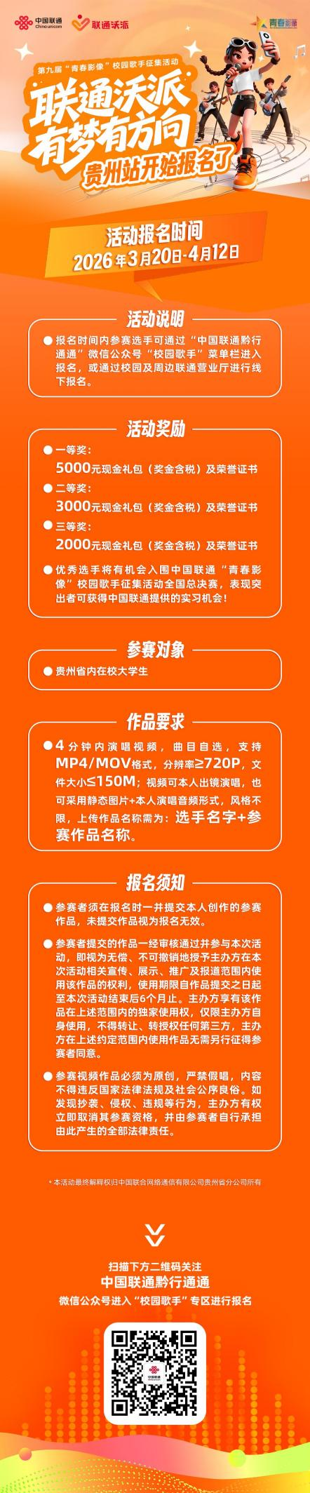 为丰富校园文化生活,展现当代青年学子昂扬向上的精神风貌,以音乐为载体传递青春正能量,近日,由共青团中央宣传部、中国电影家协会指导,中国青年报社、共青团中央网络影视中心、中国联合网络通信集团有限公司主办,中国联合网络通信有限公司贵州省分公司联合承办,联通在线信息科技有限公司协办的“联通沃派 有梦有方向”第九届“青春影像”校园歌手征集活动贵州站正式开启报名,面向贵州省各大高校在校学生发出音乐邀约,邀请广大青年学子以歌声诠释青春底色,用旋律唱响热爱与梦想。